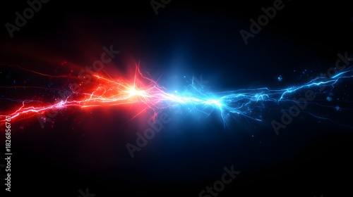 Intense energy discharge radiates with opposing red and blue electrical currents against a dark background
