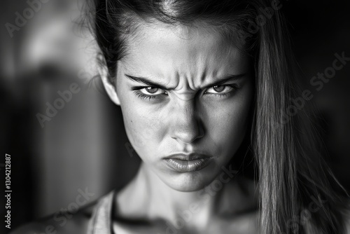Intense expression of determination captured in a striking black and white portrait of a young woman. Generative AI