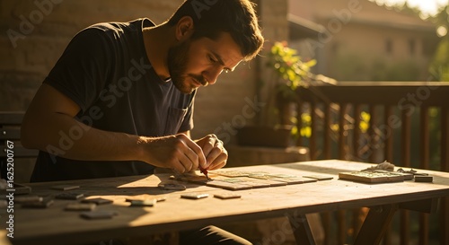 Intense Focus on Puzzle-Solving: A bearded man engages in the therapeutic pastime of assembling a jigsaw puzzle, captured in a sun-drenched outdoor setting.
