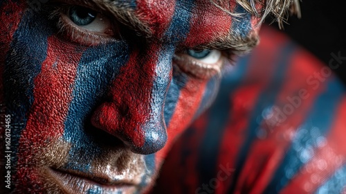 Intense Gaze: Face with Red and Blue Paint, Close-up Portrait