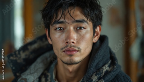 Intense gaze portrait of a young asian man in a warm hooded jacket with a thoughtful expression