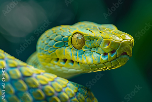 Intense Green Python Coiled on Branch, Wildlife Predator with Vibrant Scales