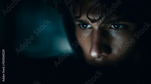 Intense hacker s face in low light with glowing screens