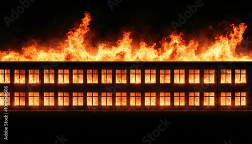 Intense Inferno: Dramatic Side View of a Burning Building with Flames Bursting Through Windows in High Contrast