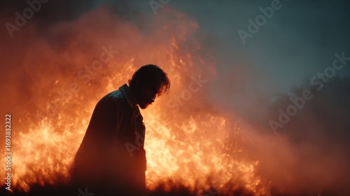 Intense moment of a man silhouetted against a raging wildfire during twilight hours