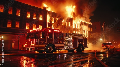 Intense Night Fire: Firefighters Responding to a Blaze in an Urban Environment