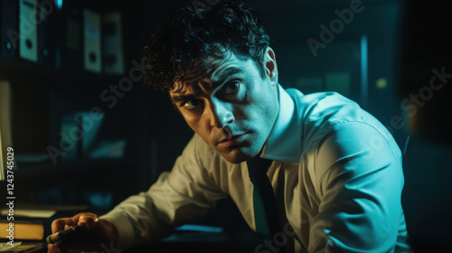 Intense Portrait of a Focused Businessman in a Dimly Lit Office, Capturing the Seriousness of Work and Intrigue in a Corporate Environment