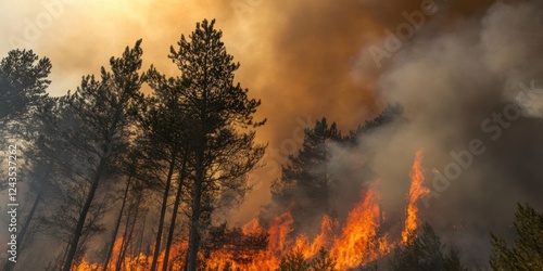 Intense wildfire engulfing forest trees amidst thick smoke and blazing flames