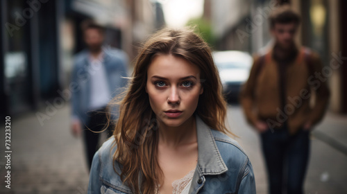 Intense Young Woman Walking Forward with Man Standing Behind in Urban Setting. City Determination Concept