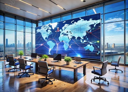 Interactive Office Screen Showcasing Global Cargo Routes for Logistics Efficiency
