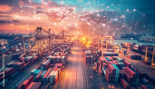 Interconnected Global Logistics Illustration: Evening Container Shipping on a Holographic World Map with Data Networks