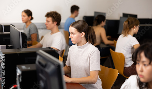 Interested teenage students during lesson in computer room of school library. Focus on young girl