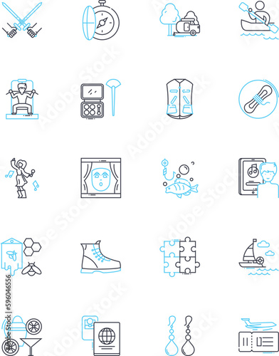 Interests linear icons set. Hiking, Baking, Photography, Painting, Gardening, Yoga, Reading line vector and concept signs. Writing,Dancing,Traveling outline illustrations