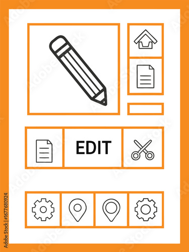 Interface Design for Edit Tools App with Pencil Home and Document Icons Featuring Scissors Gears and Location Pins in a Clean Layout