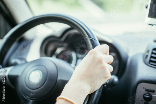 Interieur und Lenkrad eines Autos: Frau sitzt hinterm Steuer