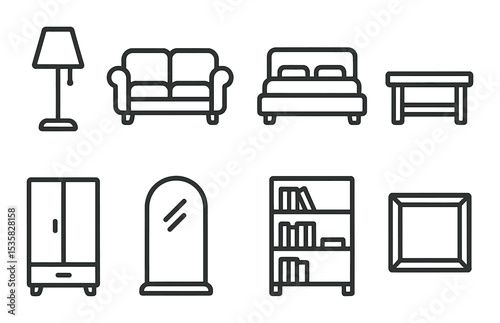 Interior decor, linear style: lamp, couch, bed, coffee table, wardrobe, mirror, bookshelf, painting frame.