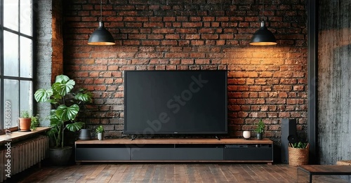 Interior design features brick wall, dark tv stand, plants. Modern living room with warm lighting, wooden floor. Minimalist style.