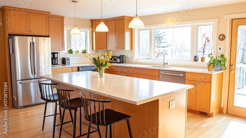 interior design kitchen island bar materials. A bright, modern kitchen featuring wooden cabinets, a large island, stainless steel appliances, and natural light streaming through ample windows.