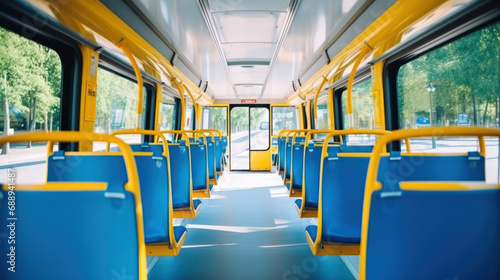 Interior design of a modern bus. Empty bus interior. Public transport in the city. Passenger transportation. Bus with blue seats and yellow handrails.