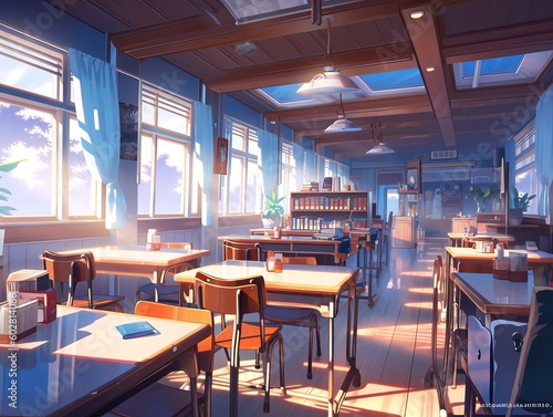 interior design of a restaurant in anime style and vibrant colors. Generative ai