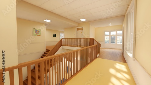 Interior Design of a School Hallway with Wooden Stairs and Railing