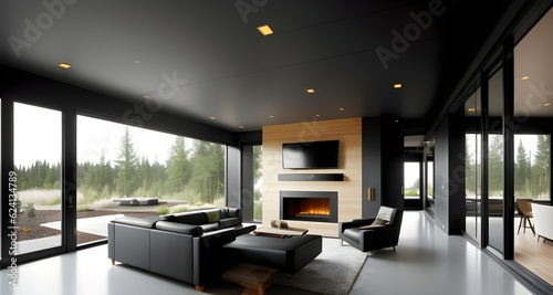 interior design, open plan, kitchen and living room, modular furniture with cotton textiles, wooden floor, high ceilinginterior design, open plan, kitchen and living room, modular furniture with cotto