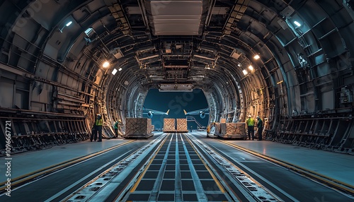 Interior of a cargo aircraft with personnel loading packages for transport.