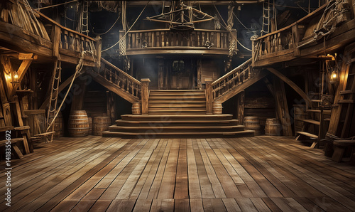 Interior of a grand wooden pirate ship with intricate details and warm lighting.
