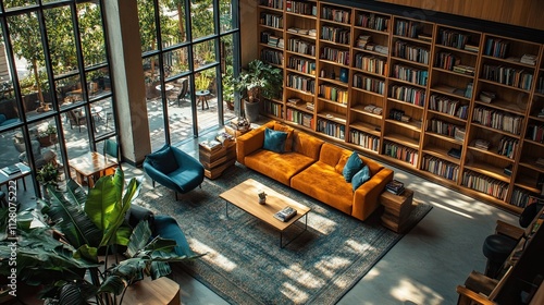 Interior of a hotel living room from above, featuring a couch, bookshelves, and panoramic window.