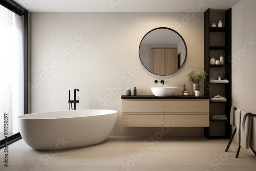 Interior of a modern bathroom featuring a floating vanity, oval bathtub, round mirror, and minimalist decor, creating a serene and stylish atmosphere