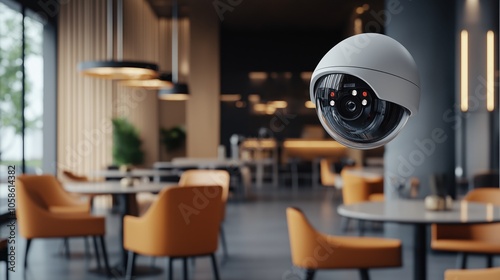Interior of a modern cafe with orange chairs and tables, featuring a prominent security camera in the foreground, hanging from the ceiling with focus on electronic surveillance.
