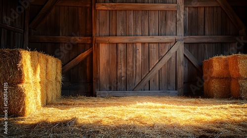 Interior of a rustic wooden barn with hay bales present