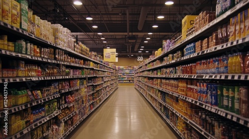 Interior of a supermarket with shelves of neutral-toned items and ample aisle space. acd9-903650531e20