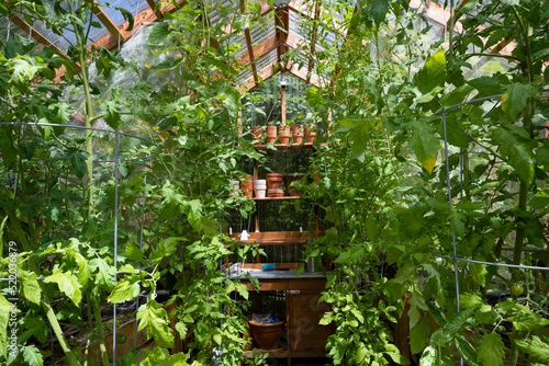 Interior of a wooden domestic greenhouse for growing vegetables in August