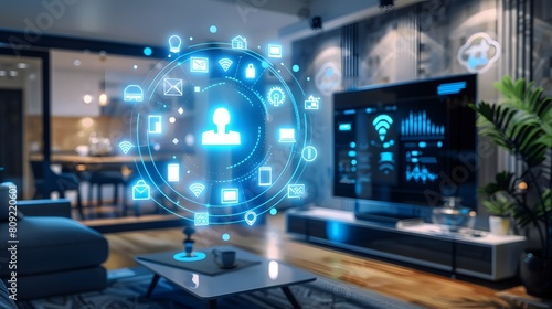Interior of AI augmented reality smart home, Modern smart home components management system. Internet of things concept