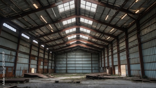 Interior of an abandoned metal barn showcasing industrial architecture and weathered materials in a desolate factory setting