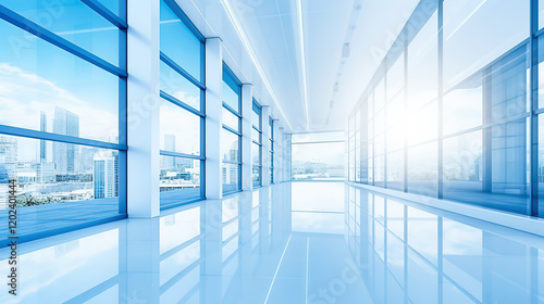 Interior of bright office with blue walls, panoramic windows and daylight.