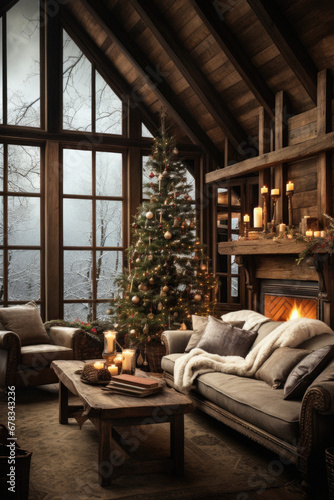 Interior of cozy living room with Christmas tree, fireplace and comfortable sofa.
