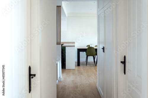 Interior of empty passage with white walls and closed doors