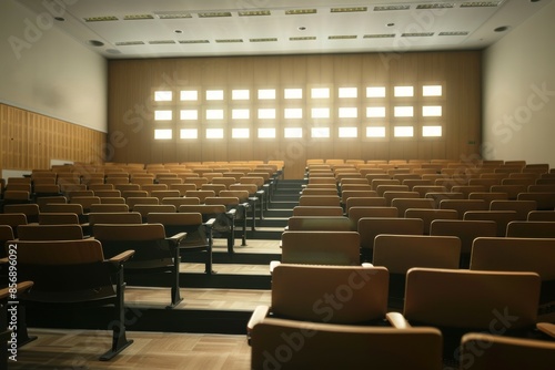 Interior of illuminated lecture hall. Empty chairs are arranged in classroom. Auditorium is in university