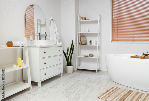 Interior of light bathroom with bathtub, chest of drawers and houseplant