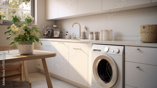 Interior of light kitchen with washing machine, laundry basket and white counters