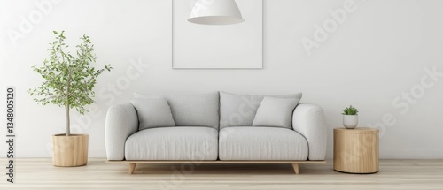 Interior of living room modern style with grey fabric sofa,wooden side table and white ceiling lamp on wooden floor.