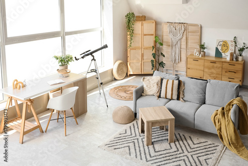 Interior of living room with telescope, sofa and workplace