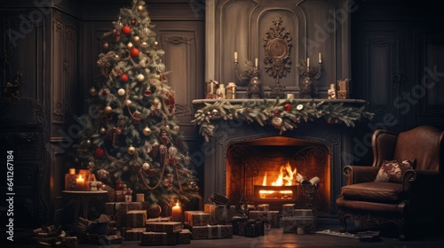 Interior of luxury classic living room with Christmas decor. Blazing fireplace, garlands and burning candles, elegant Christmas tree, gift boxes. Christmas and New Year celebration concept.
