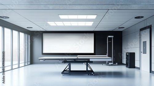 Interior of modern empty office buildingOpen ceiling designEquipped with automatic lifting table and LCD screen : Generative AI