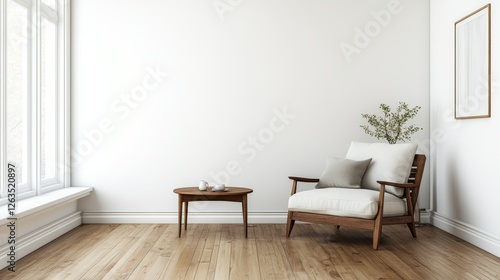 Interior of modern living room with white walls, wooden floor, a fireplace and wooden armchair standing near small coffee table. 3d rendering