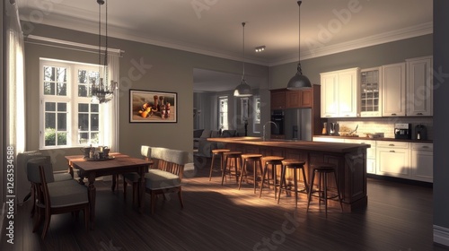 Interior of spacious kitchen with grey walls, dark wooden floor, comfortable dining table with soft armchairs, bar with stools and wooden countertops in background. 3d rendering