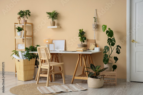 Interior of stylish office with comfortable workspace, books, modern laptop and houseplants