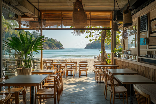 Interior of the cafeteria restaurant on the beach, Nice view cafe near the beach, Landscape view of beachside restaurant with cozy vibe and relax.